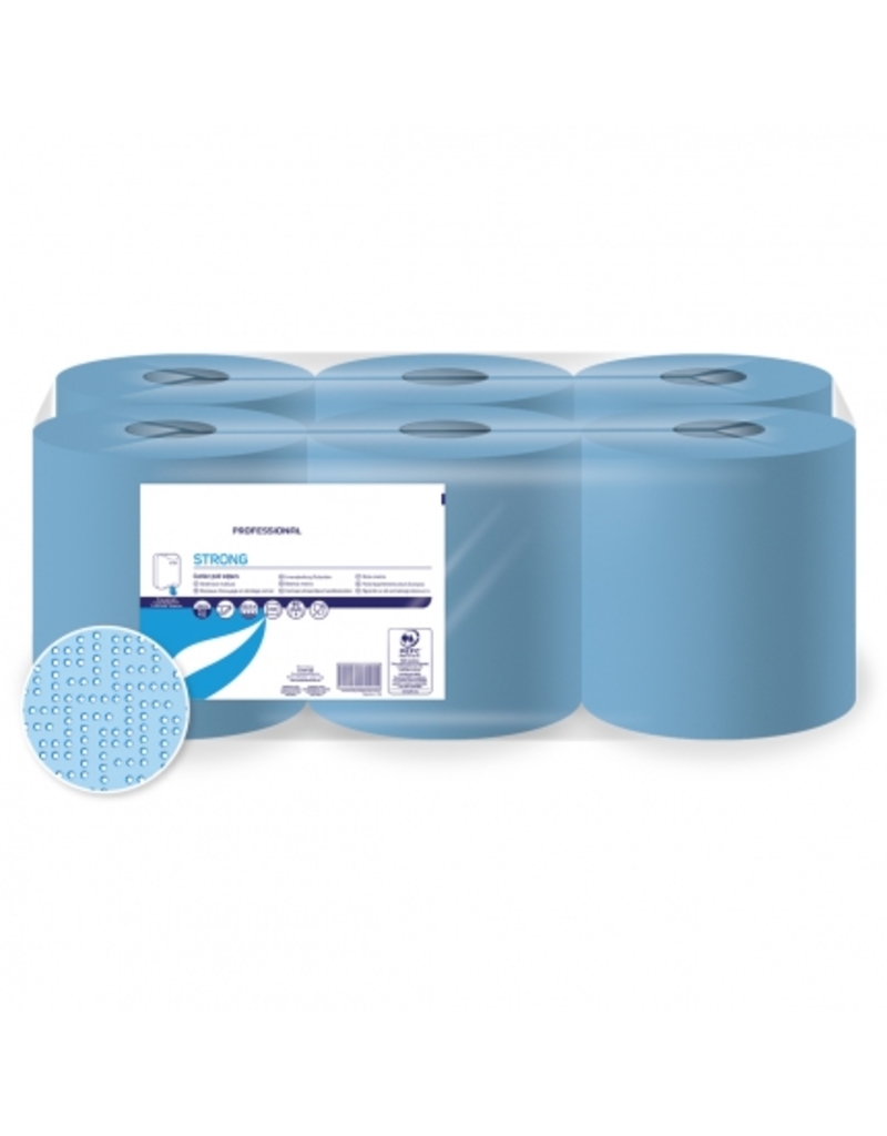 Papier d'essuyage midi bleu 1pli. Bobine midi à dévidage central. 6 x ±300m. 1 pli bleu. Prix hors TVA : 25,86 €