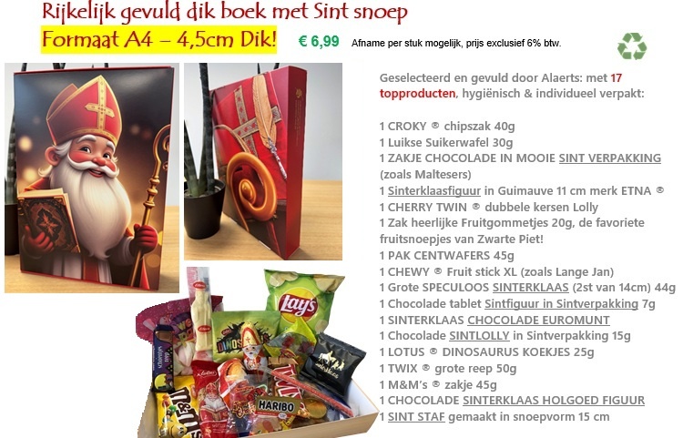 Het grote boek van Sinterklaas gevuld met snoepgoed merkproducten. Met topproducten als inhoud. Uniek knappe verpakking! PRODUCT IS WEL OP VOORRAAD maar enkel op bestelling via mail, bestel tijdig! Hofleverancier van Sinterklaas sinds 1995! (Zie foto: voorkant en achterkant boek)